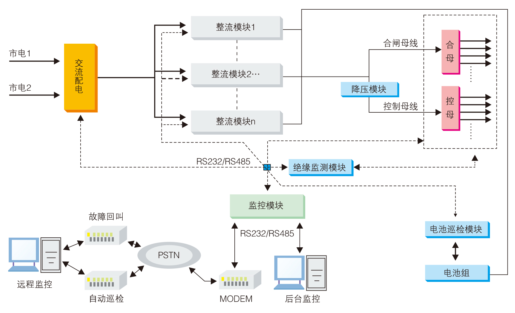 8、采用以微處理器為核心的集散式監(jiān)控系統(tǒng),模塊化設(shè)計(jì),實(shí)施對(duì)電源系統(tǒng)全方位的監(jiān)測(cè)和控制以及電源系統(tǒng)的“四遙”及無(wú)人值守。